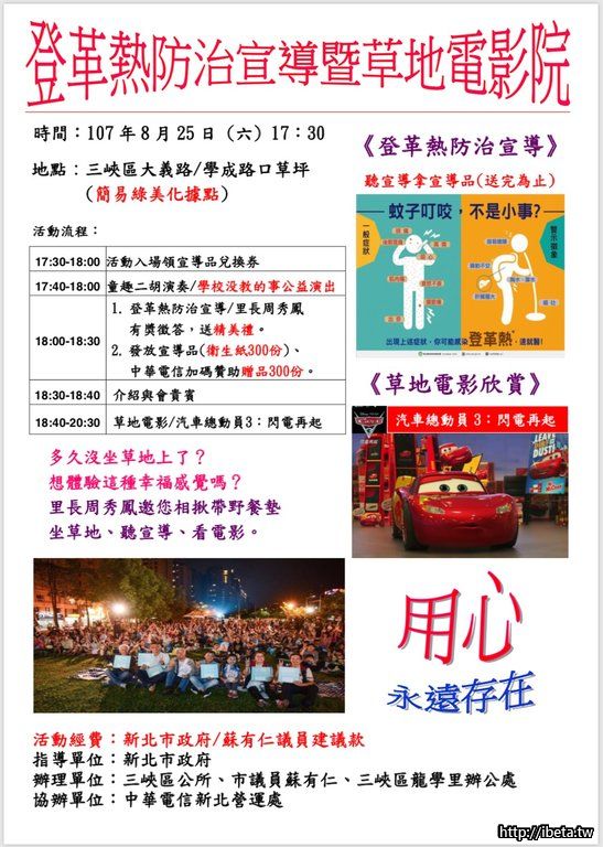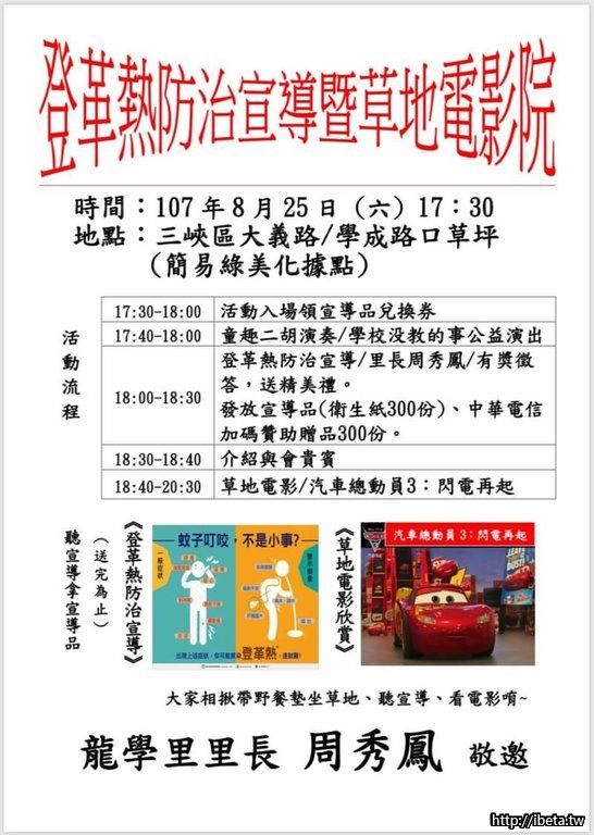 登革熱防治宣導暨草地電影院,時間:107年8月25日 (六) 17:30;地點:三峽區大義路/學成路口草坪(簡易 ...
