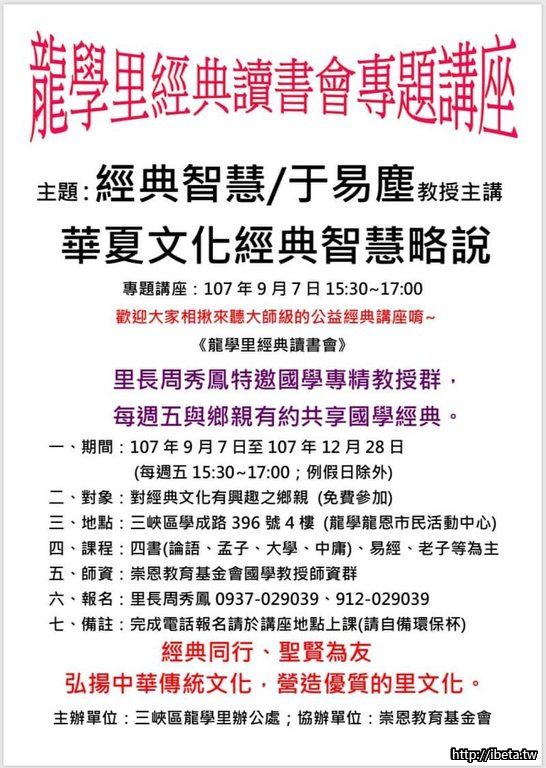 《龍學里經典讀書會》特邀國學專精教授群,每週五與鄉親有約共享國學經典,歡迎大家相揪來聽大師級的公益經典講座唷~