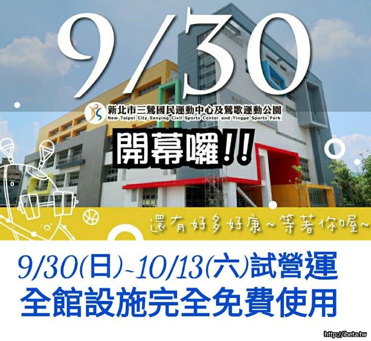 9/30上午10:30三鶯國民運動中心啟用暨試營運典禮,地點:三峽區文化路210巷12號。
