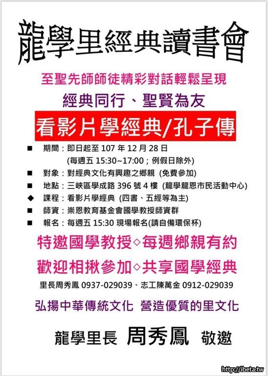 《龍學里經典讀書會》看影片學經典/孔子傳每週五下午特邀國學教授師資群,與鄉親有約共享國學經典,歡迎大家相揪來參加唷。《龍學里里長 周秀鳳 敬邀》