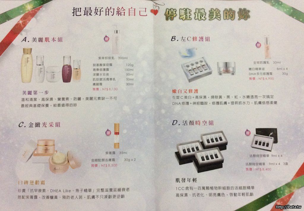 2019年 聖誕特惠產品開始囉~任選購一組贈送一瓶超值保養品,任選購2組不同套組再加贈格藍絲絨毯乙件,108/12/31截止喔~~ps.老朋友&11/05~12/31活動期間的壽星另外再加碼 ~除了超值贈品 依照標價再打9折喔~趕快來搶購吧~{:4_153:}{:4_153:}{:4_153:}