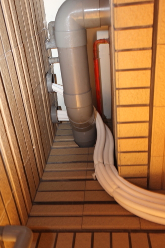 後陽臺的出線孔位置有一支大通風管剛好擋到.