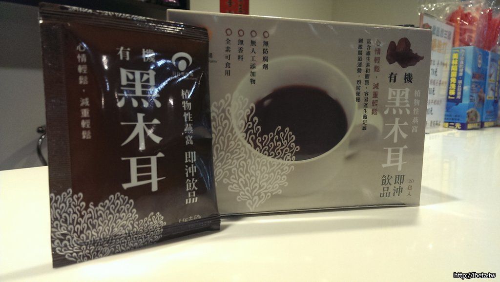 《有機黑木耳即沖飲》,設計為即沖飲品,採小袋包裝、一包一杯,適合於晨間、午茶時間、用餐前飲用,可代替早餐、下午茶果腹解饞,餐前飲用可控制食慾,飲用的同時,也攝取了黑木耳的各種營養素,是一箭好幾鵰的優良選擇。