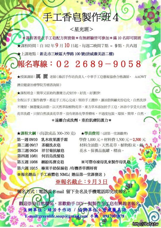 報名方式:電話.私訊或E-mail 至[email]greenlife.soap@gmail.com[/email]留下全名及手機電話即完成報名。