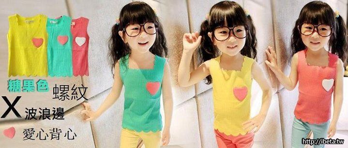 夏季女童糖果色超萌純棉套裝 "愛心波浪花邊背心" 搭配 "貼布七分褲"