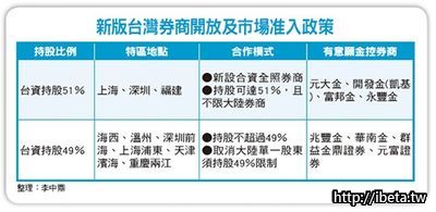 除了上海、深圳及福建合資「全牌照」之外,據了解,中國證監會已同意台資券商設立合資全照券商,但持股上限為四九%,六大金改試驗區,包括海西經濟區、溫州、深圳前海、上海浦東、天津濱海、重慶兩江等。由於台資券商在六大金改特區合資持股上限四九%,但合資對象不限一家,讓台資券商仍有機會掌握控制力,排名前十大的獨立券商躍躍欲試。