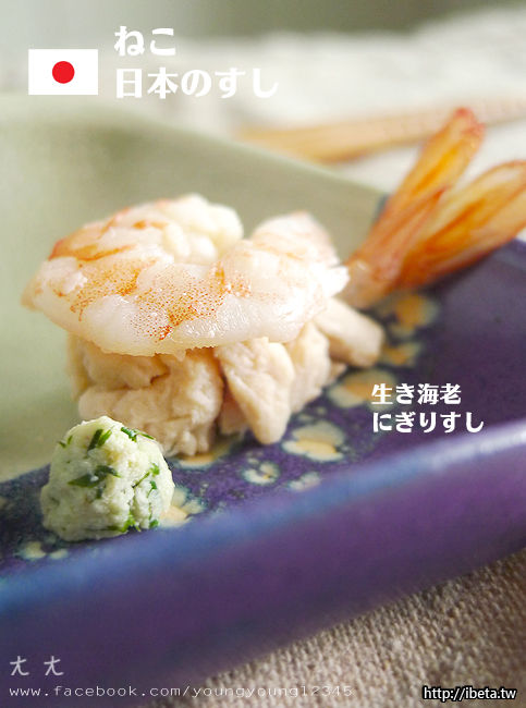 直送無藥白蝦握壽司+現磨貓草雞肉仿山葵