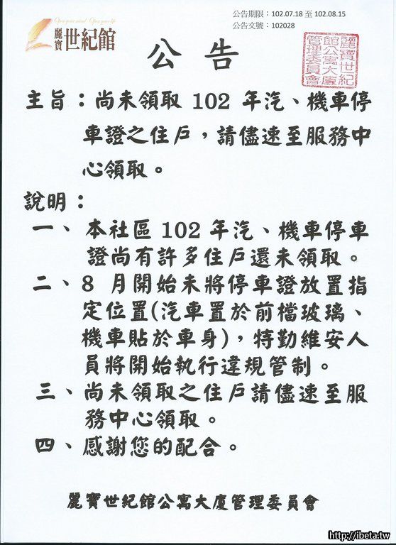 公告102028儘速領取102年停車證