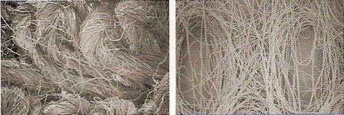 上圖顯示的是純綿布料(左圖)及不織布(右圖)放大35倍後的纖維結構。