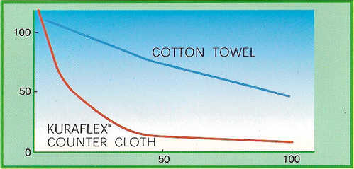 上圖所示的圖表顯示了普通棉質抹布與不織布的晾乾速度做比較。從圖上所示,不織布的晾乾速度比棉質抹布要快上許多。簡單的來說~細菌因不織布再很短的時間內就可將抹布內的溼度降到最低,細菌也較不易再此布料上繁殖~
