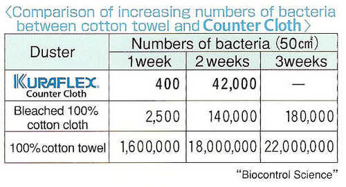 純綿材質的抹布之含菌量在使用過後第一週以達1,600,000,當使用過後的第二週其含菌量更暴增至18,000,000,經過三週使用後,純綿材質的含菌量已從原先的1,600,000增至22,000,000。試想,通常會把抹布使用至如第一張圖所示的狀態將會是經過多少週的使用呢?其含菌量的數量可想而知一定比上面所示的數據更加驚人!