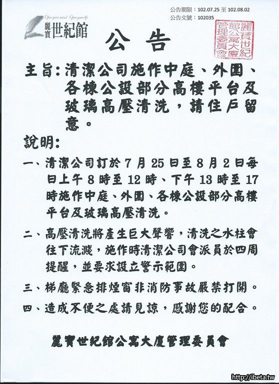 公告102035清潔施作中庭、外圍、公設高樓等高壓清洗