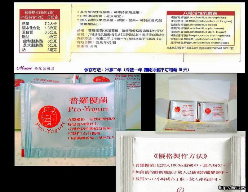 *將一包普羅優菌倒入一公升鮮乳中,充分搖勻後,再放入優格製造機中插電發酵6-12小時即可食用。