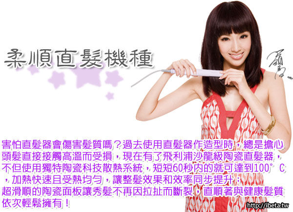 直順髮光環輕鬆擁有!每天和毛燥的頭髮對抗,總是花了很多時間和精力,怎麼整理還是缺少光澤亮度感嗎?直長髮就是要有亮麗髮質才能突顯氣質喔!推薦這款飛利浦沙龍級陶瓷直髮器HP8300,是直髮器的入門機種,功能卻一點也不馬虎!加熱速度快速且均勻,60秒即可使用,節省早晨寶貴時間,超滑順陶瓷表層,在整髮過程中不會因拉扯導致頭髮斷裂,保護您的秀髮直順並閃亮有型,還有貼心吊環設計和便捷式平板鎖等設計,方便出外攜帶使用喔!