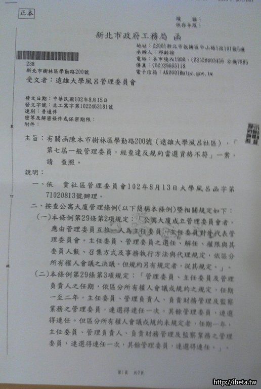 取得這份公文如附件,第二條第一項就再次強調 "規約另有規定者,從其規定"。違反規約就没什麼好說的,還能投票罷免主委,這是什麼世界。委員會難道都沒有律師可以去請教嗎?什麼營建署的解釋函文,亂七八糟的斷章取義。社區窮到連請教社區律師的錢都沒有嗎?一整個亂搞。