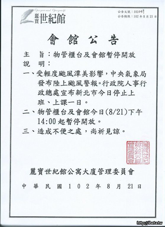 公告102049受颱風影響會館暫停開放一日