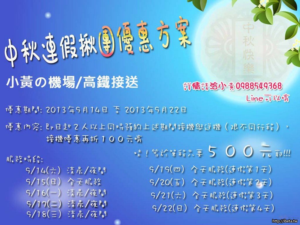 小黃知道中秋連假將至,將會有許多鄰居需要接送服務,即日起提供上述中秋優惠給鄰居們~