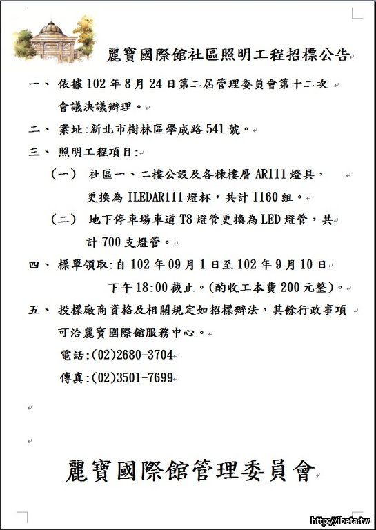 (一) 社區一、二樓公設及各棟樓層AR111燈具, 更換為ILEDAR111燈杯,共計1160組。