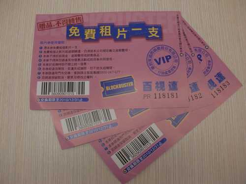 上周幫俺老爹買了部DVD player,廠商很沒誠意的送了3張快到期(2010/12/31)的百事達租片卷,還限直營店使用勒~(問過客服,最近的直營店應該是新莊店吧)