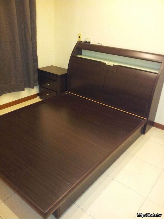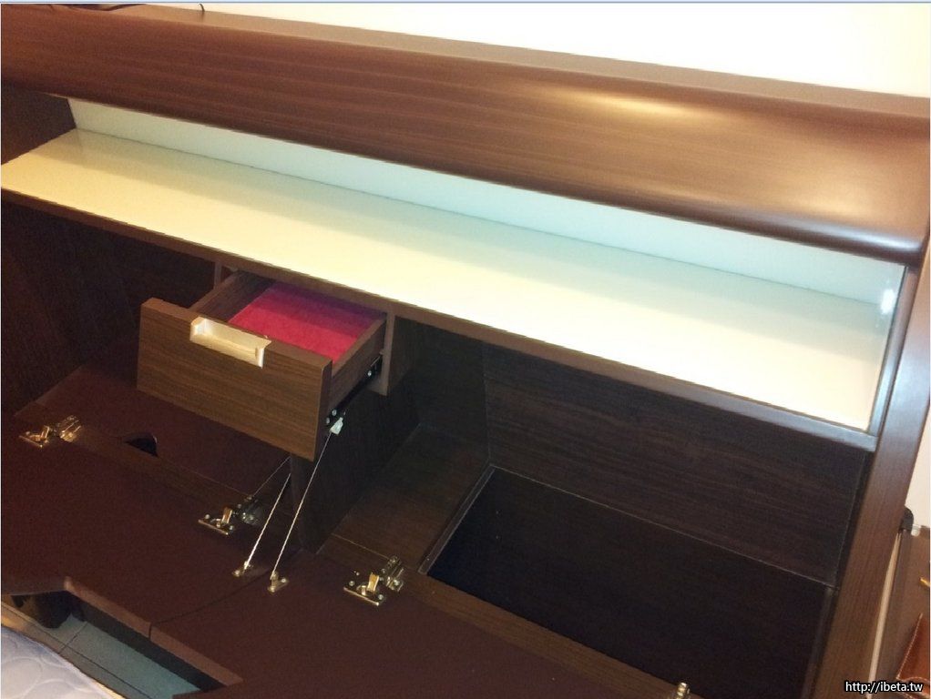 床頭櫃 - 掀開後如圖 - 左右共四大格收納空間,中間有隔板區隔,上頭有感應式床頭燈(左右共兩盞,其中一盞燈泡需自行更換)