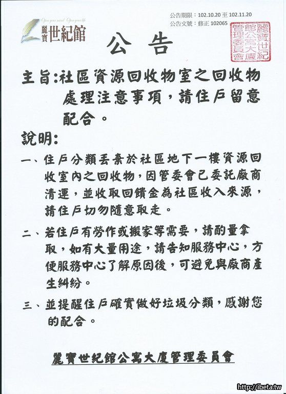 修正公告102065資源回收室處理注意事項