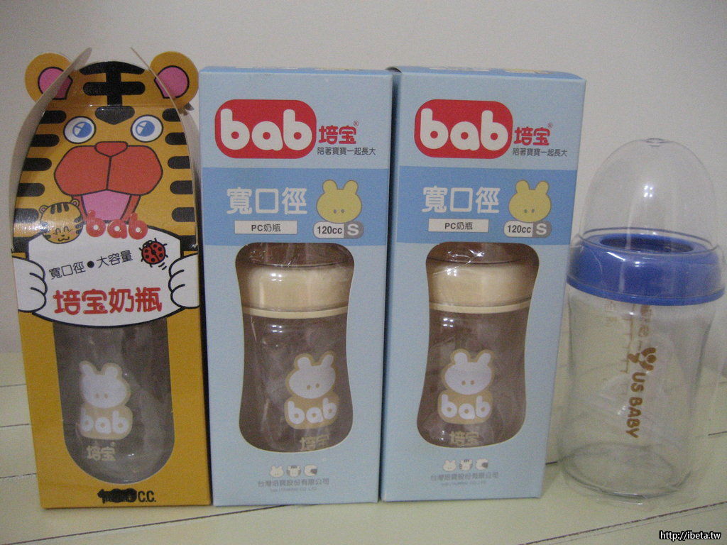 左三個為培寶PC奶瓶,右一為優生玻璃奶瓶