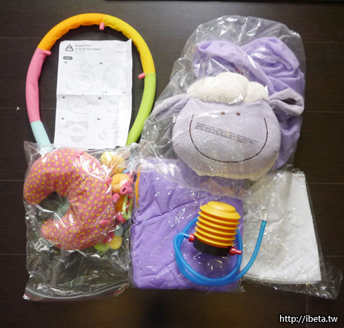 內含配件: 3個毛絨小動物掛件、2個充氣袋、1個太陽花坐墊