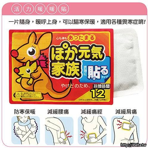 驅寒保暖,溫暖12小時,最高溫 63℃ ,平均溫 53℃ ,適用各種畏寒症,季替代厚重的衣物,提供溫暖的保障。柔軟富彈性,可貼於人體肩部、背部、腰部、關節部位,快速熱敷,發熱持久穩定。秋冬之季貼心的為家中的長輩、小孩準備,驅寒保暖之必備用品。本產品採用不織布、原料層、明膠層三部份製作而成,原料層由鐵、石、活性炭、無機鹽、水等合成的聚合物,無毒、無副作用,非常環保,可與空氣中氧化作用下發生放熱反應。不織布的特點是均勻不漏,透氣性佳。明膠層選用日本特有的價質壓敏膠塗層,粘貼牢固,不污損衣物。