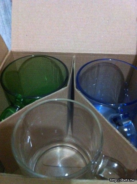 一盒三入馬克杯(玻璃:透明、藍色、綠色),共有兩盒,一盒$100]---已售出一盒[/color]