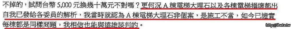 而A棟電梯誠如林前主委判斷的,就是遠雄施工不當,林前主委也很證實,然後呢? 為何遠雄不願負責?