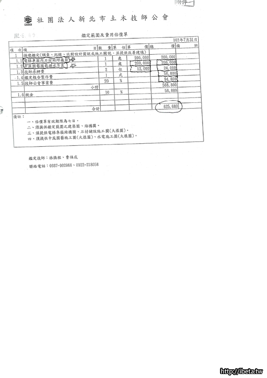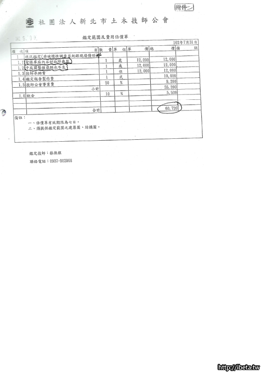 這5000元就只是請土木技師來會勘,走一趟的費用,社區得到的是一張報價單,內容是: 如果要產生會勘的報告需要60720 (A棟電梯及園藝排水處,若還要確認勘驗結果報告總共報價是約68萬(A棟電梯20萬,園藝排水20萬......其它......印象中的報價單)