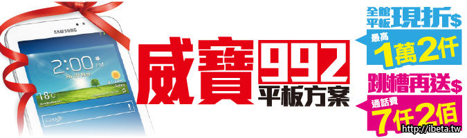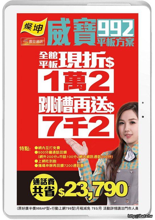 起至12/31止,只要至震旦門市購買館內任一平板電腦商品,搭配威寶月租992月租專案(原月租986型+上網799型),綁約30個月專案,最高可現折1萬2千元。攜碼申辦除了可得到「圓仔熊貓抱枕」和通話費回饋7千2百元。