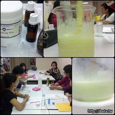 今天上的是與芳香有關的課程, 利用棕櫚乳化蠟做介質,讓油與水能相融合.