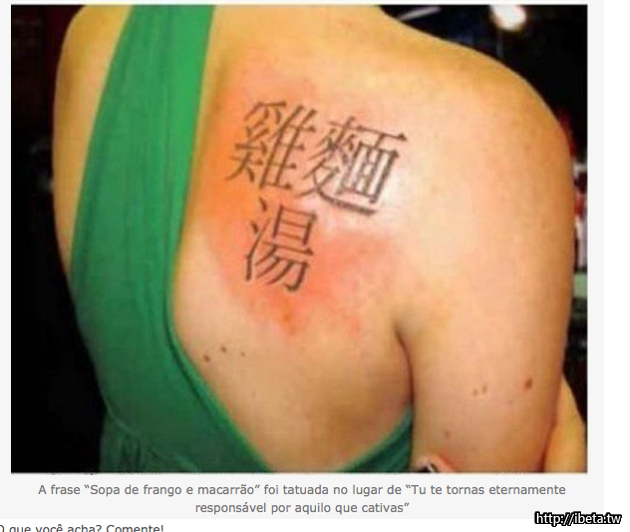 自從許多國際知名影星、球星在身上刺中文字便蔚為一種潮流,但也因為外國人不懂中文字鬧出許多笑話。近日巴西一名刺青師不懂中文字,因此竟然大惡搞自己的客戶,將「想怎麼收穫,就怎麼栽」刺成「雞湯麵」遭到警方逮捕。