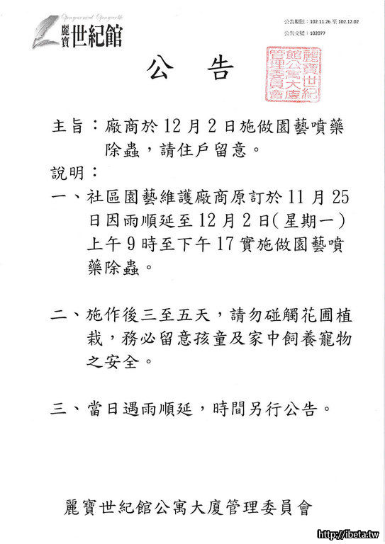 公告園藝噴藥時間請住戶留意