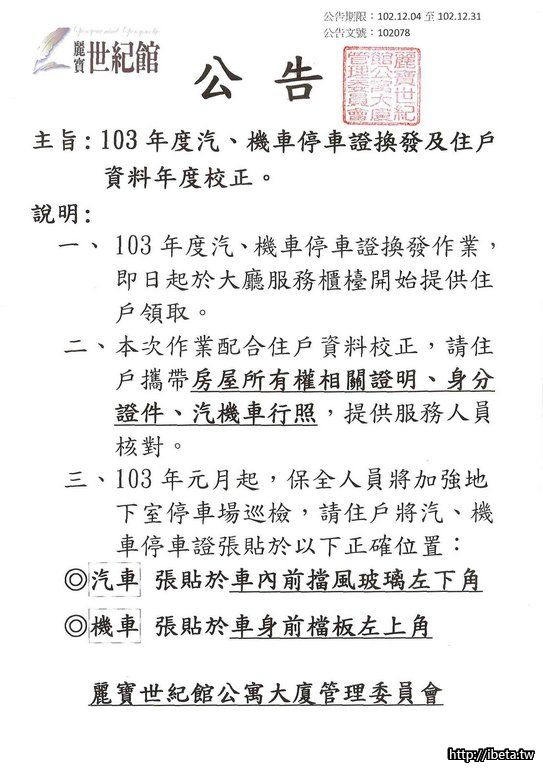 roger651017 發表於 2013-12-10 12:00 你的建議很可行喔 而且啊,這次區權會前其實也公告請住戶自行前往櫃臺更新資料。