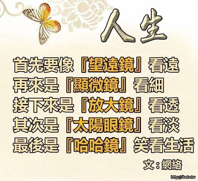 不過人生要做到的原則教條怎麼這麼多呢?我覺得人生要簡單就是回歸清淨的本性,讓本性盡量去清淨了,自然一切該做的就會盡量去做,不該做的就盡量不會去做;而這樣的過日子就應該不會偏離正道太遠了啦!