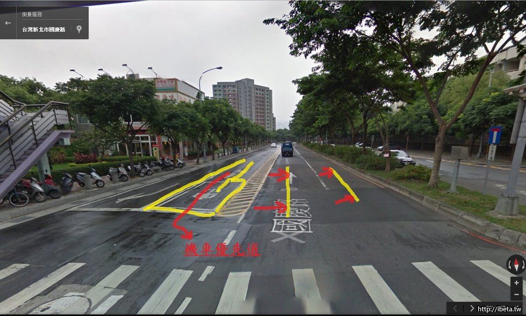 另外,國慶路(其實是學成路)擁塞的問題,可以考慮,將學成路接近復興路口的路中間黃色障礙線,往停車場方向移動,將出北大特區的車道變寬,擁有兩線道,並劃出機車優先道,讓機車安全地行進;進入北大特區的慢車道,則縮減一些。
