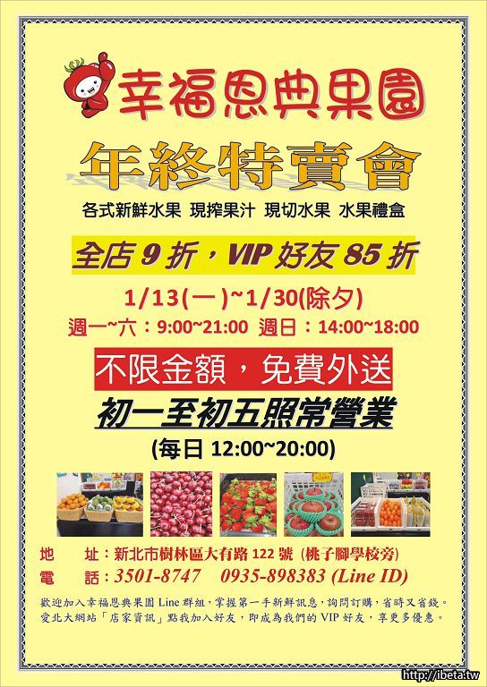 幸福恩典果園年終特賣會登場囉!從下禮拜一1/13起,到除夕1/30當天,全店九折優惠,恩典VIP好友更享八五折!