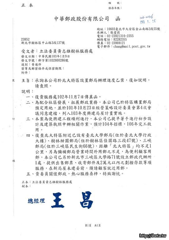 報告鄉親!北大特區增設郵局有譜了!已列入今年計畫編列預算,預計104年辦理發包、106年完工,未來完工後民眾辦理郵務存匯將更便利。