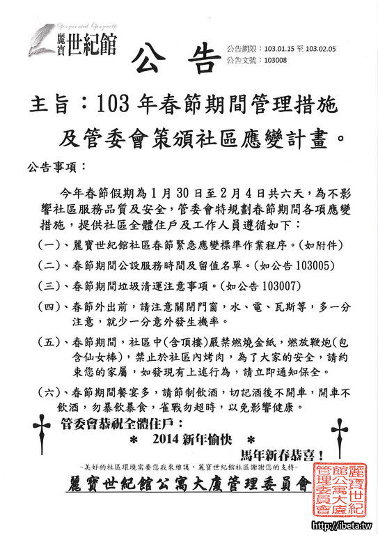 公告(事務)103年社區春節管理及應變措施