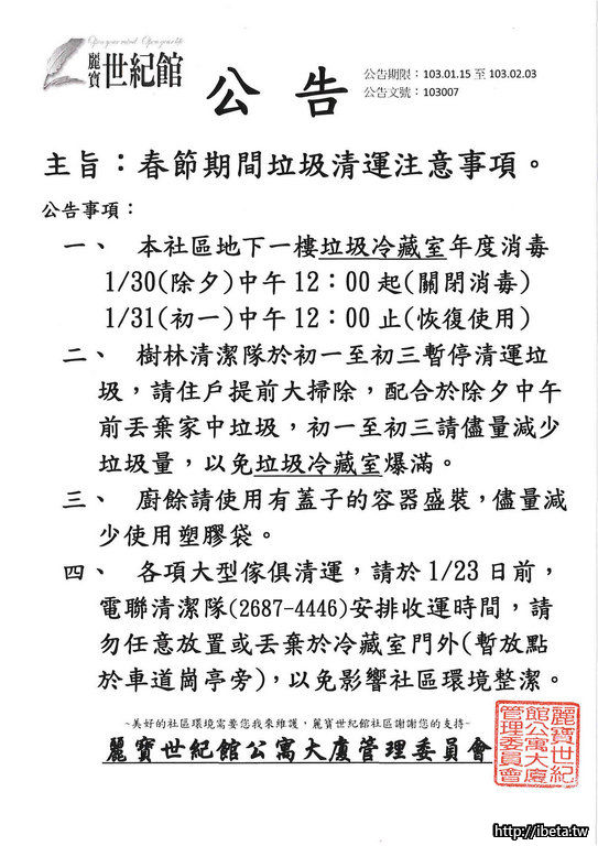 但鑑於往年經驗, 春節期間垃圾量肯定是大爆滿, 回收類的垃圾爆滿也就算了, 但是廚餘是比較傷腦筋的, 建議管委會跟清潔隊多借幾個廚餘桶"進駐", 避免可能的廚餘異味瀰漫, 甚至汙水四溢