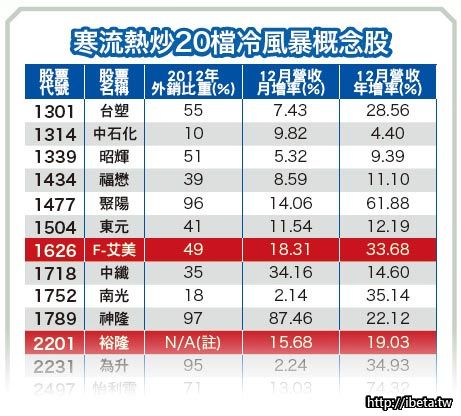 低溫效應創造的商機正在擴大,相關產業惦惦吃三碗公,從塑化、紡纖、汽車、遊戲、家電到生技等類股篩選出二十檔概念股中,以辣椒、裕隆、南六、F-艾美、中保等最為看好,值得讀者追蹤。
