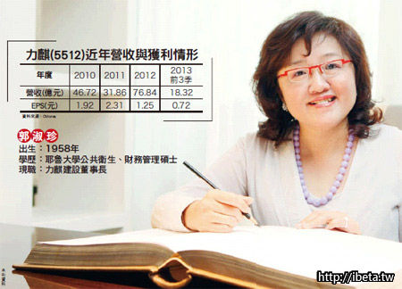 力麒建設(5512)從營建業跨足飯店業及水務工程,歷經多年的努力,逐漸步上軌道,董事長郭淑珍為展現強大的企圖心,在去(2013)年十一月二十七日引進北京控股集團為策略夥伴後,今年將正式進軍大陸。