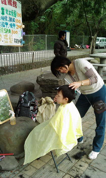 在大樹下, 在路邊, 經常可以看到理髮的小攤子, 別說理髮, 連拔牙的都有!