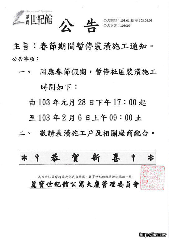 公告103009春節期間裝潢施工管制