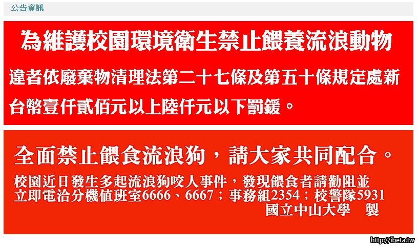 二、為維護全校師生同仁安全及環境清潔衛生,請師生同仁配合辦理全面禁止餵食流浪狗。