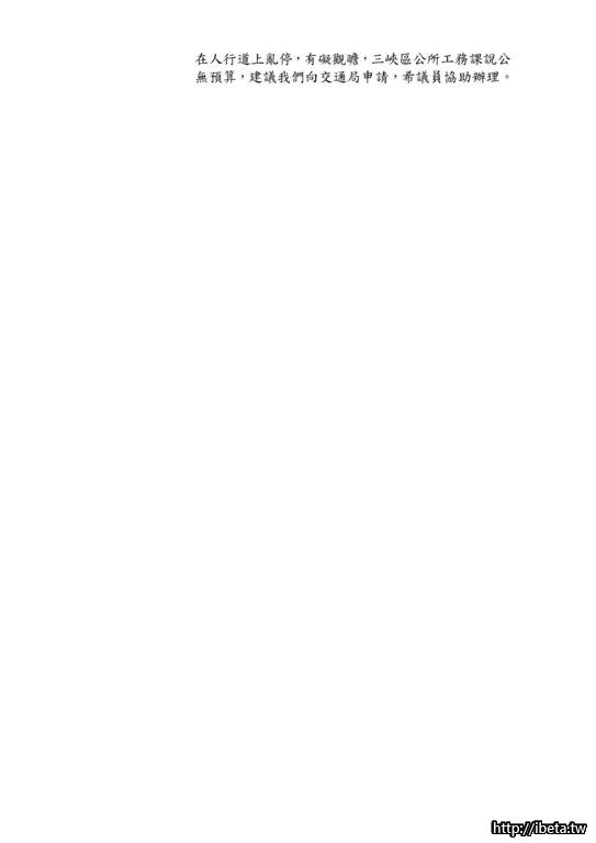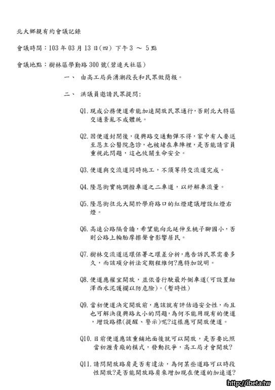 您好!每周四鄉親有約已將近舉辦200場超過4年,應民眾建議巡迴各社區辦理,從運動公園設施規劃、交通動線號誌調整、人行道整治、下水道排水系統、公車路線爭取等已完成許多民眾建議案,也包含去年動工北大聯外道路開闢、三鶯二橋動工、三鶯線101年可行性核定及今年將動工樹林交流道及三鶯交流道增設北上匝道,明年將完工通車、三峽運動公園等重大建設,皆曾於此會議中報告,且具體行文、辦理會勘、議會提案、編列經費等程序,非常感謝鄉親支持,我們將持續努力,謝謝