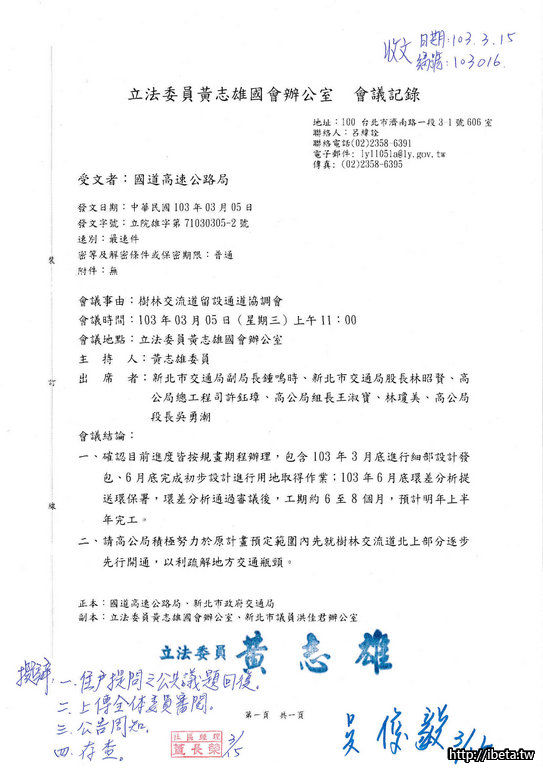 收文103016黃志雄委員回覆交流道便道案