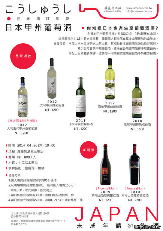 在春暖花開的四月,我們挑選了五款日本精英酒廠所釀製的甲州葡萄酒,並加碼兩款西班牙香醇紅酒與您一同分享,喜歡的朋友千萬不要錯過!名額有限,報名請早!